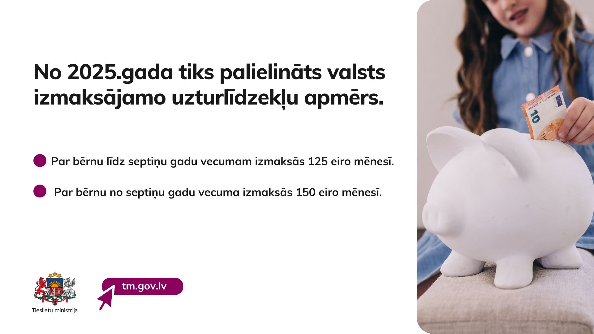 Otrdien, 1.oktobrī, valdība atbalstīja Tieslietu ministrijas priekšlikumu no 2025.gada palielināt valsts izmaksājamo uzturlīdzekļu apmēru. Paredzēts, ka Uzturlīdzekļu garantiju fonda izmaksājamo uzturlīdzekļu apmērs par bērnu līdz septiņu gadu vecumam būs 125 eiro mēnesī, bet par bērnu no septiņu gadu vecuma 150 eiro mēnesī. Patlaban šīs summas ir attiecīgi 107,50 eiro un 129 eiro.